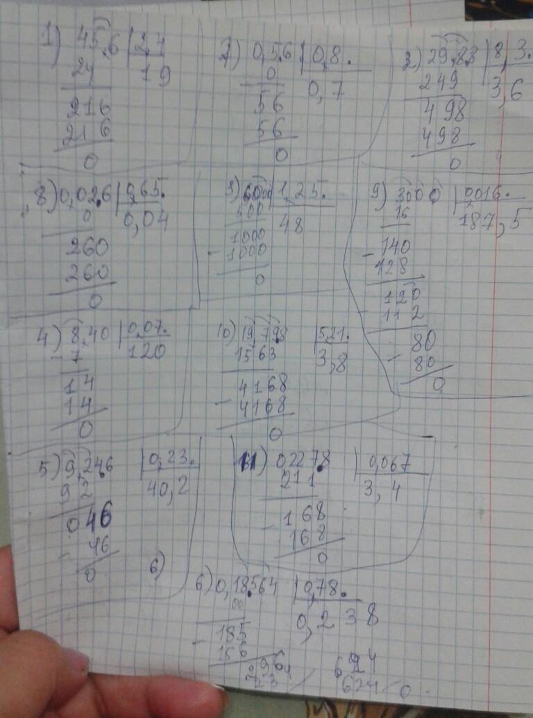 982.° Виконайте ділення: 1) 45,6 : 2,4; 7) 0,56 : 0,8; 2) 29,88 : 8,3; 8) 0,026 : 0,65; 3) 60 : 1,25; 9) 3 : 0,016; 4) 8,4 : 0,07; 10) 19,798 : 5,21; 5) 9,246 : 0,23; 11) 0,2278 : 0,067; 6) 0,18564 : 0,78; 12) 24,1248 : 0,048. от 1 до 8 в столбик решение!