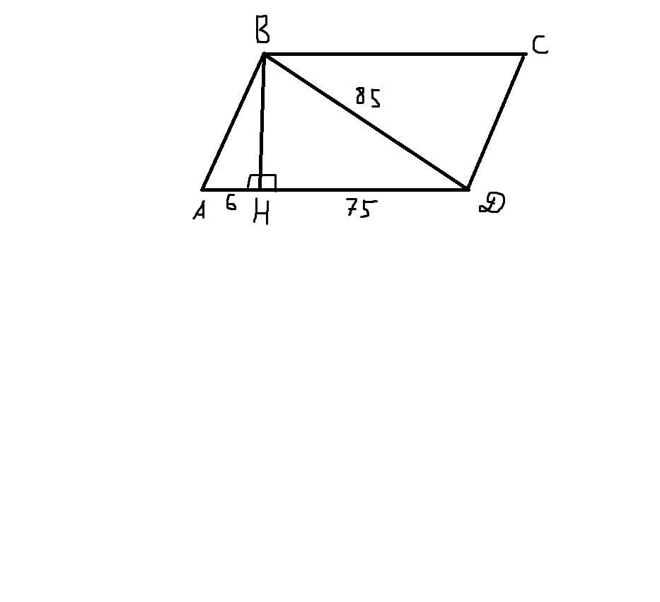 Высота BH параллелограмма ABCD делит его сторону AD на отрезки AH = 6 и HD = 75. Диагональ параллелограмма BD равна 85. Найдите площадь параллелограмма.