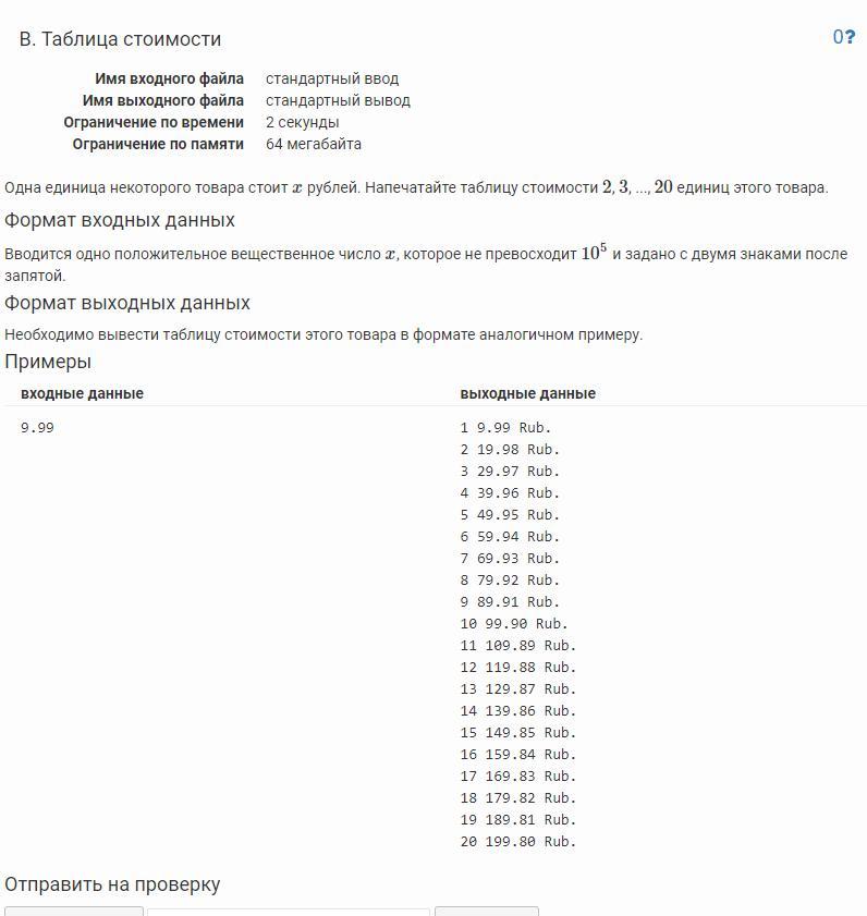 for i:=1 to 20 do write(i, ' ', a * i, ' Rub.', #13, #10);