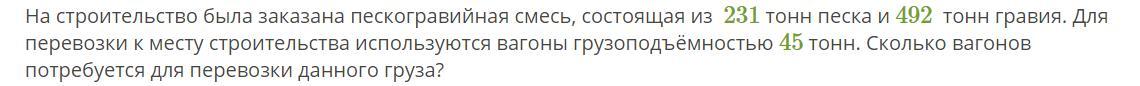 На строительство была заказана пескогравийная смесь, состоящая из 231 тонн песка и 492 тонн гравия. Для перевозки к месту строительства используются вагоны грузоподъёмностью 45 тонн. Сколько вагонов потребуется для перевозки данного груза?