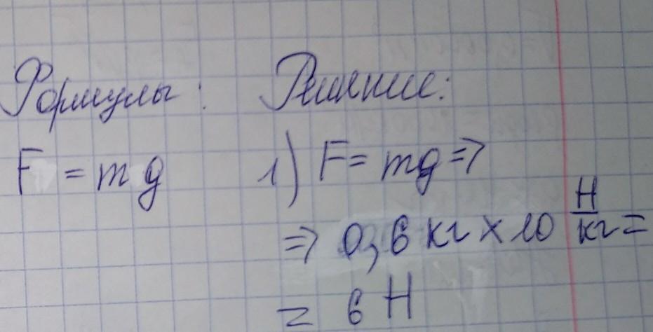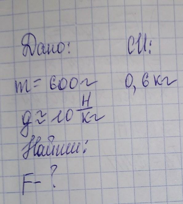 Решение: F=mg=0,6кг×10Н/кг=6Н