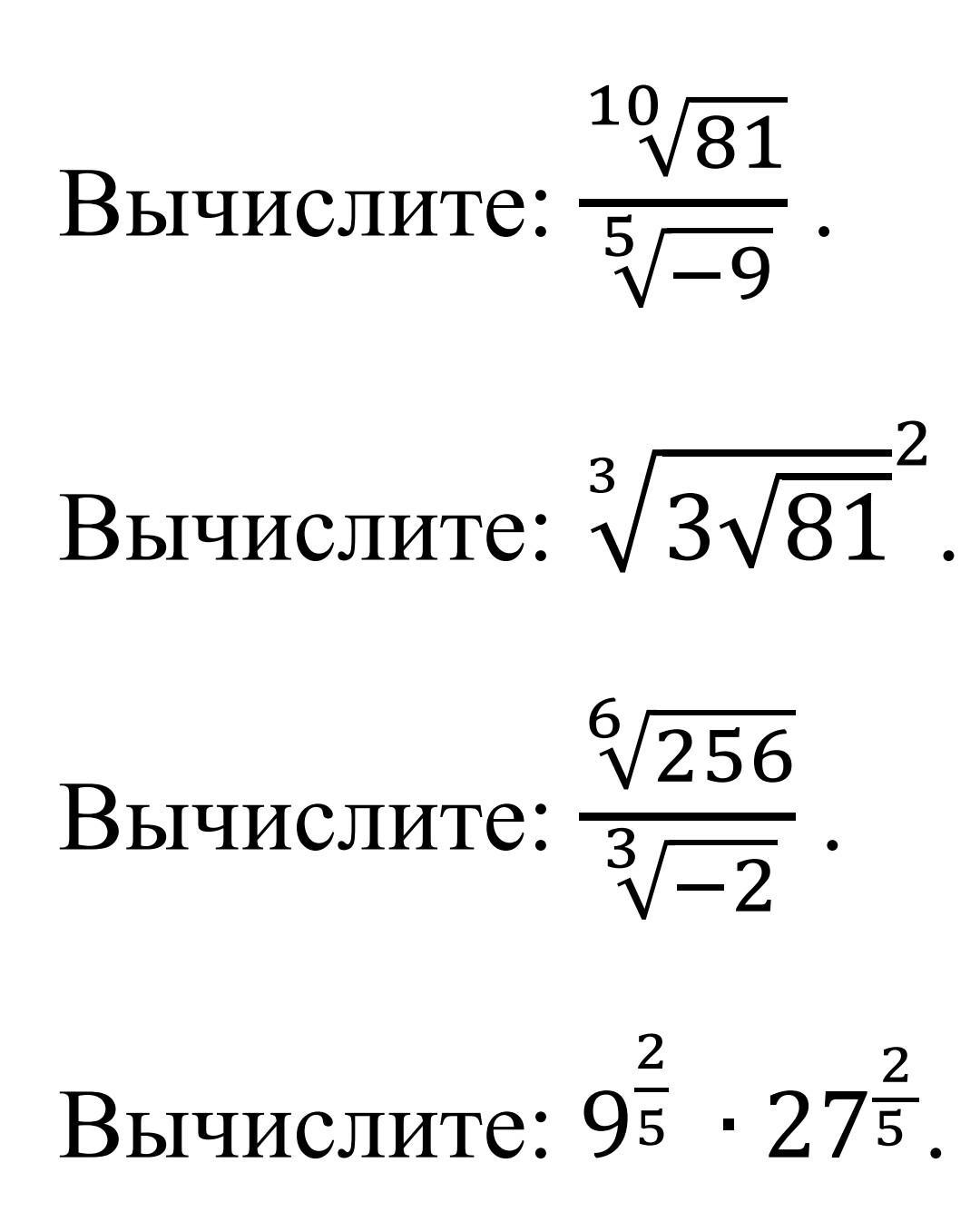 displaystylefrac{sqrt[10]{81}}{sqrt[5]{-9}}=frac{sqrt[10]{9^2}}{sqrt[5]{-9}}=frac{sqrt[5]{9}}{sqrt[5]{-9}}=sqrt[5]{frac{9}{-9}} =sqrt[5]{-1}=-1\\\ sqrt[3]{3sqrt{81}}^2=sqrt[3]{3cdot9}^2=sqrt[3]{3cdot3^2}^2=sqrt[3]{3^3}^2=3^2=9\\\ frac{sqrt[6]{256}}{sqrt[3]{-2}}=frac{sqrt[6]{2^8}}{sqrt[3]{-2}}=frac{sqrt[3]{2^4}}{sqrt[3]{-2}}=sqrt[3]{-frac{2^4}{2}}=sqrt[3]{-2^3}=-2