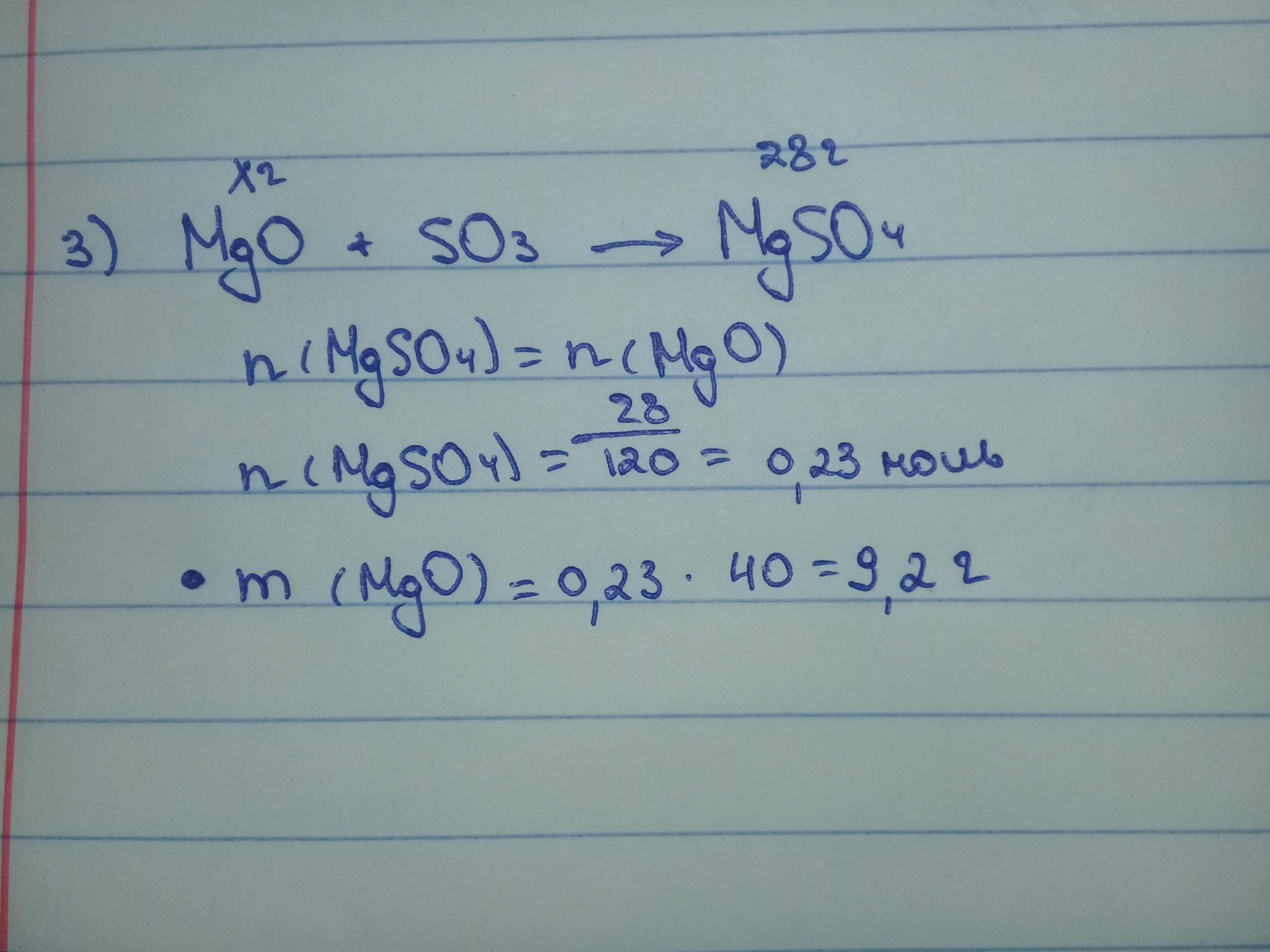3. При взаимодействии оксида магния и оксида серы VI образовалось вещество массой 28 г.