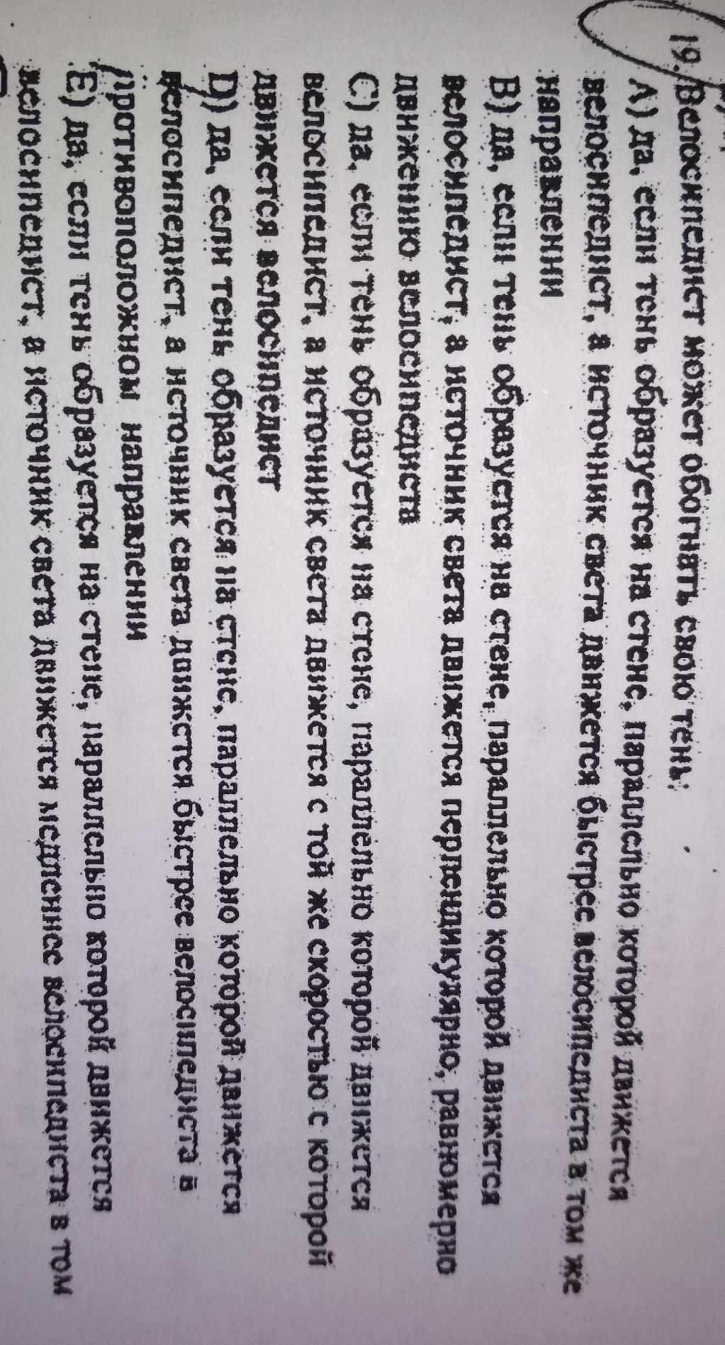 Может, тень образуется на стене, параллельно которой движется велосипедист, а источник света движется быстрее велосипедиста и в том же направлении - ответ А)