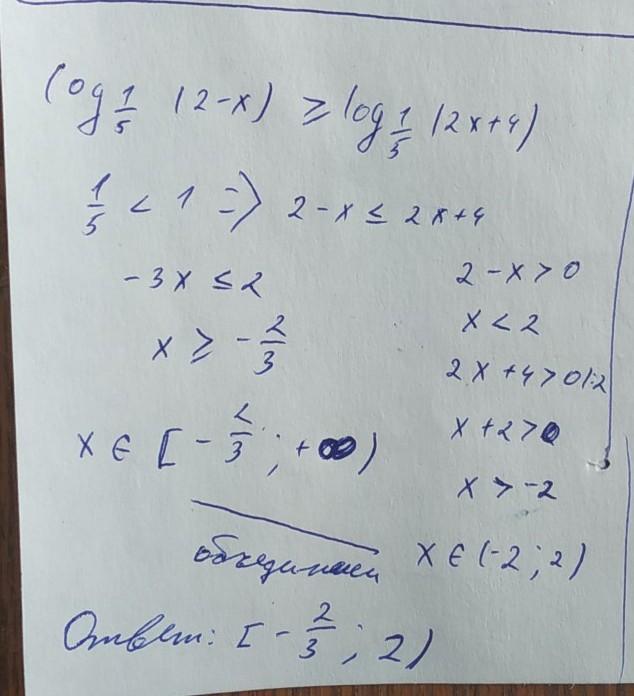 РЕШИТЬ НЕРАВЕНСТВО log1/5 (2-x) больше или равно log1/5 (2x+4)
