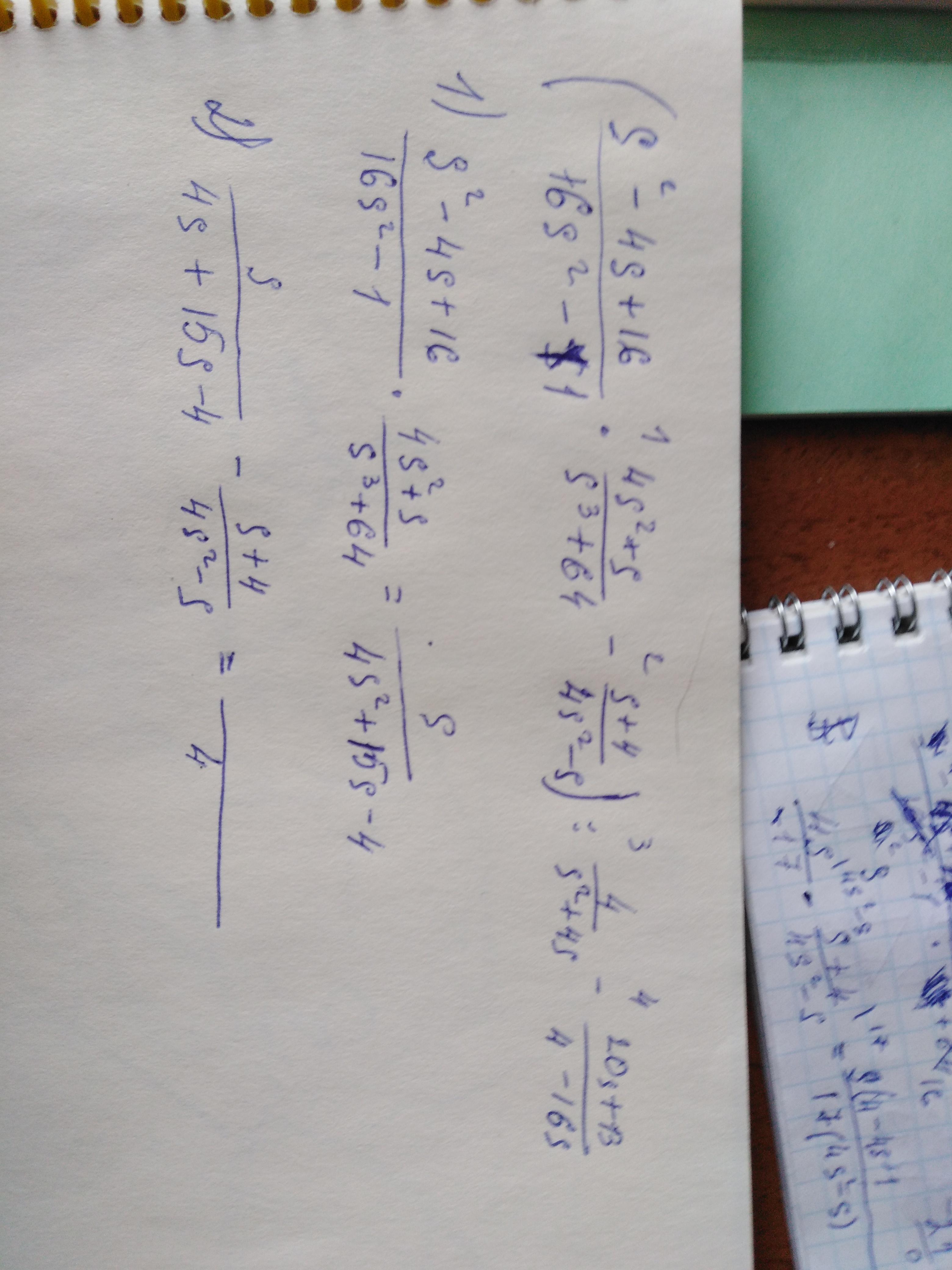 1)frac{s^{2}-4s+16 }{16s^{2}-1 }*frac{4s^{2}+s }{s^{3}+64 }=frac{(s^{2}-4s+16)*s*(4s+1) }{(4s+1)(4s-1)*(s+4)(s^{2}-4s+16)} =frac{s}{(4s-1)(s+4)}\\2)frac{s}{(4s-1)(s+4)}-frac{s+4}{4s^{2}-s }=frac{s}{(4s-1)(s+4)}-frac{s+4}{s(4s-1)}=frac{s^{2}-s^{2}-8s-16}{s(4s-1)(s+4)}=frac{-8(s+2)}{s(4s-1)(s+4)}