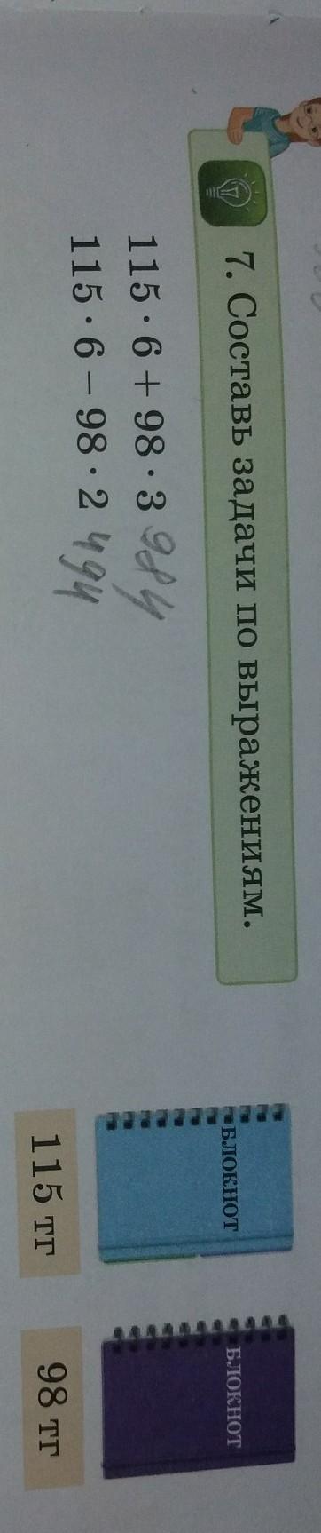 Юля купила 6 синих блокнотов по цене 115 тг. Также она купила 3 фиолетовых блокнота по цене 98 тг. Сколько всего заплатила Юля за покупку?