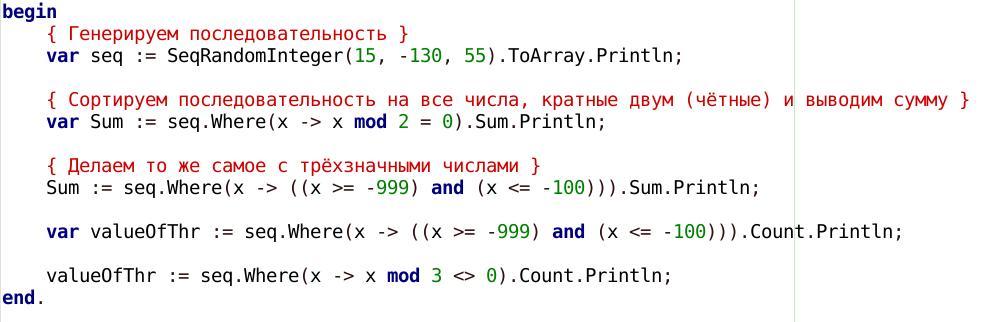 Задана последовательность из 15 чисел на интервале (-130, 55). Найти сумму чётных чисел,сумму и количество трёхзначных чисел, и количество чисел, некратных трём.