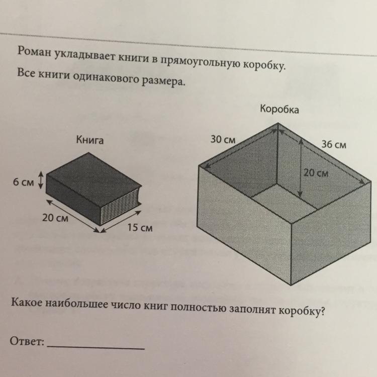 Роман укладывает книги в прямоугольную коробку. Все книги одинакового размера. Какое наибольшее число книг полностью заполнят коробку?