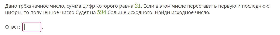 Дано трёхзначное число, сумма цифр которого равна 21. Если в этом числе переставить первую и последнюю цифры, то полученное число будет на 594 больше исходного. Найди исходное число.
