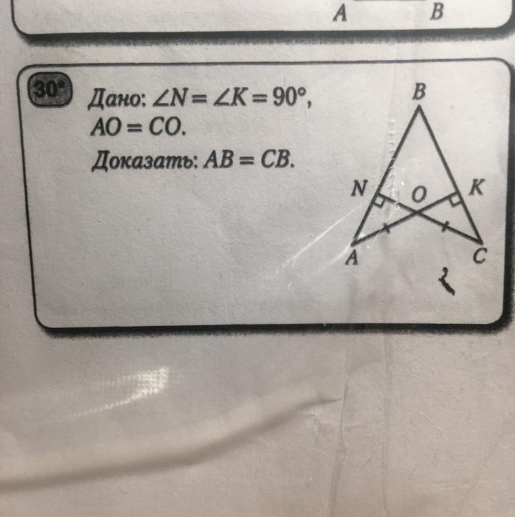 Кто шарит в геометрии HELP PLEASE. Дано: угол N= углу K= 90•, AO=CO. Доказать: AB=CB.