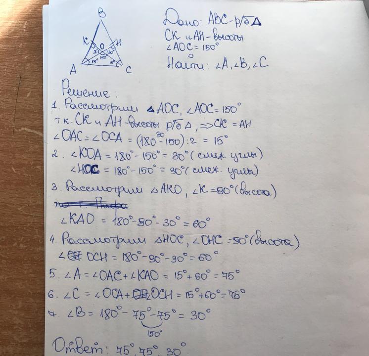 Из точки пересечения высот равнобедренного треугольника его основание видно под углом 150 градусов. Найдите углы треугольника. C рисунком ,а также хотелось бы с Дано