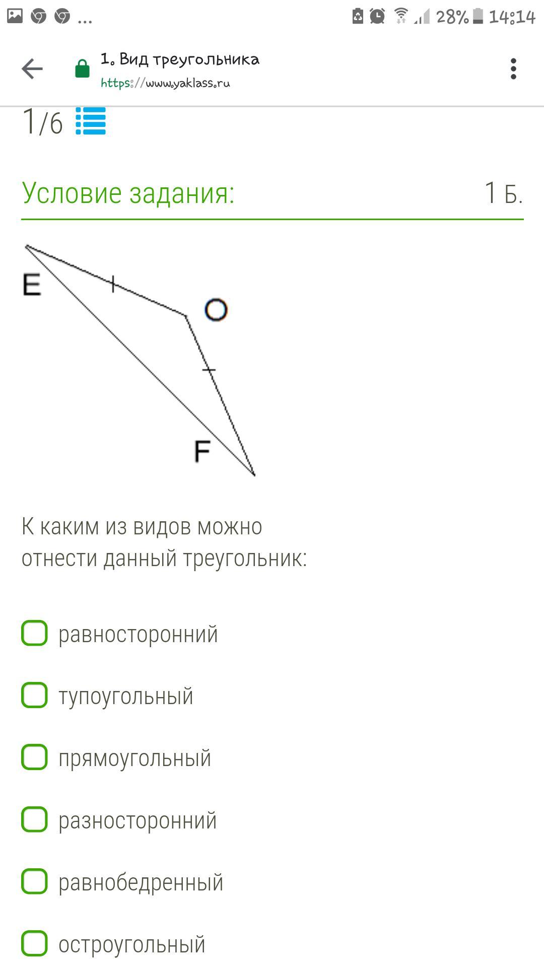 Он тупоугольный и равнобедренный, т.к. две его стороны: ЕО и OF равны.