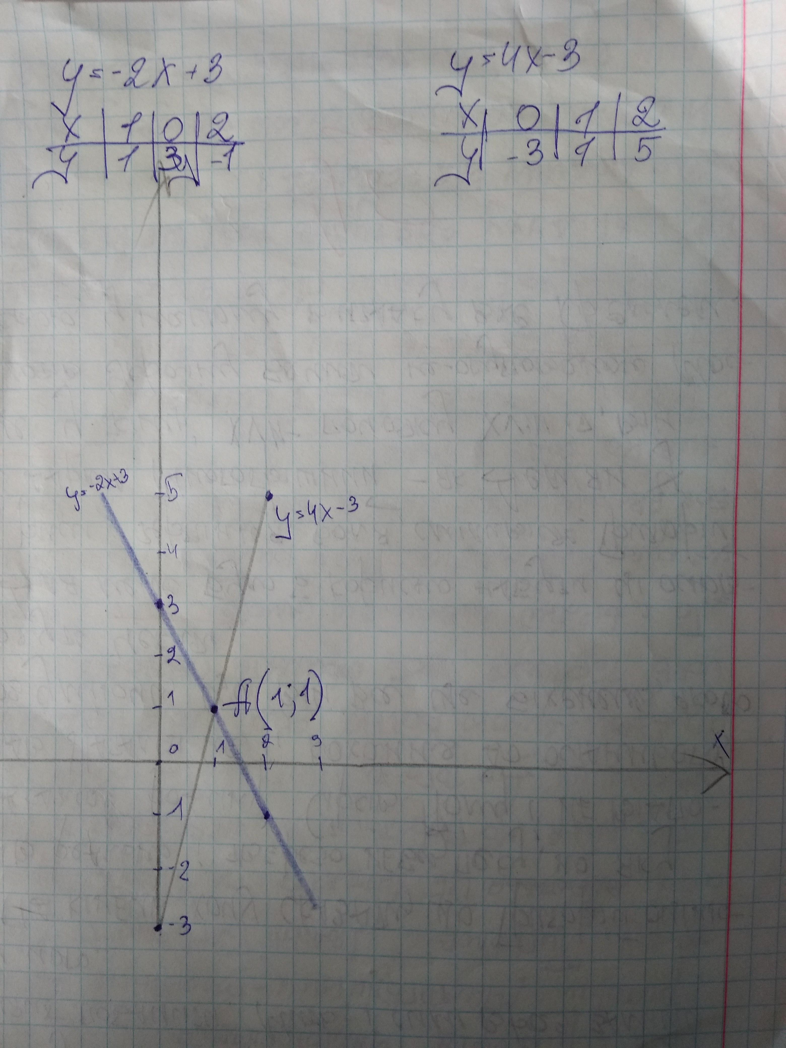 Постройте в одной и той же системе координат графики функций у = -2х + 3 и у = 4х - 3 и укажите координаты точки пересечения.