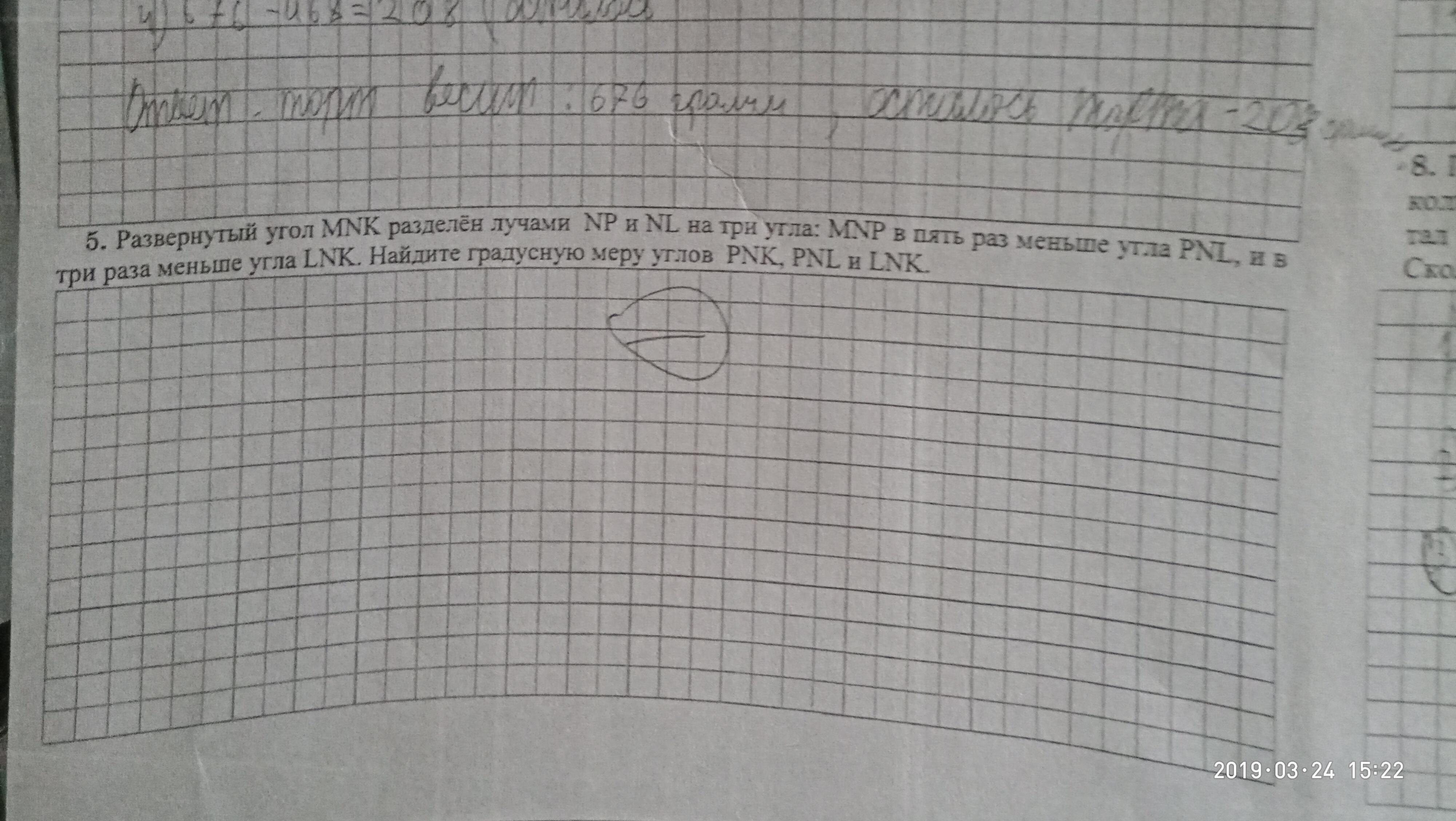 Пусть угол MNP - х. Тогда угол PNL - 5x а угол LNK - 3x. Развернутый угол = 180°.