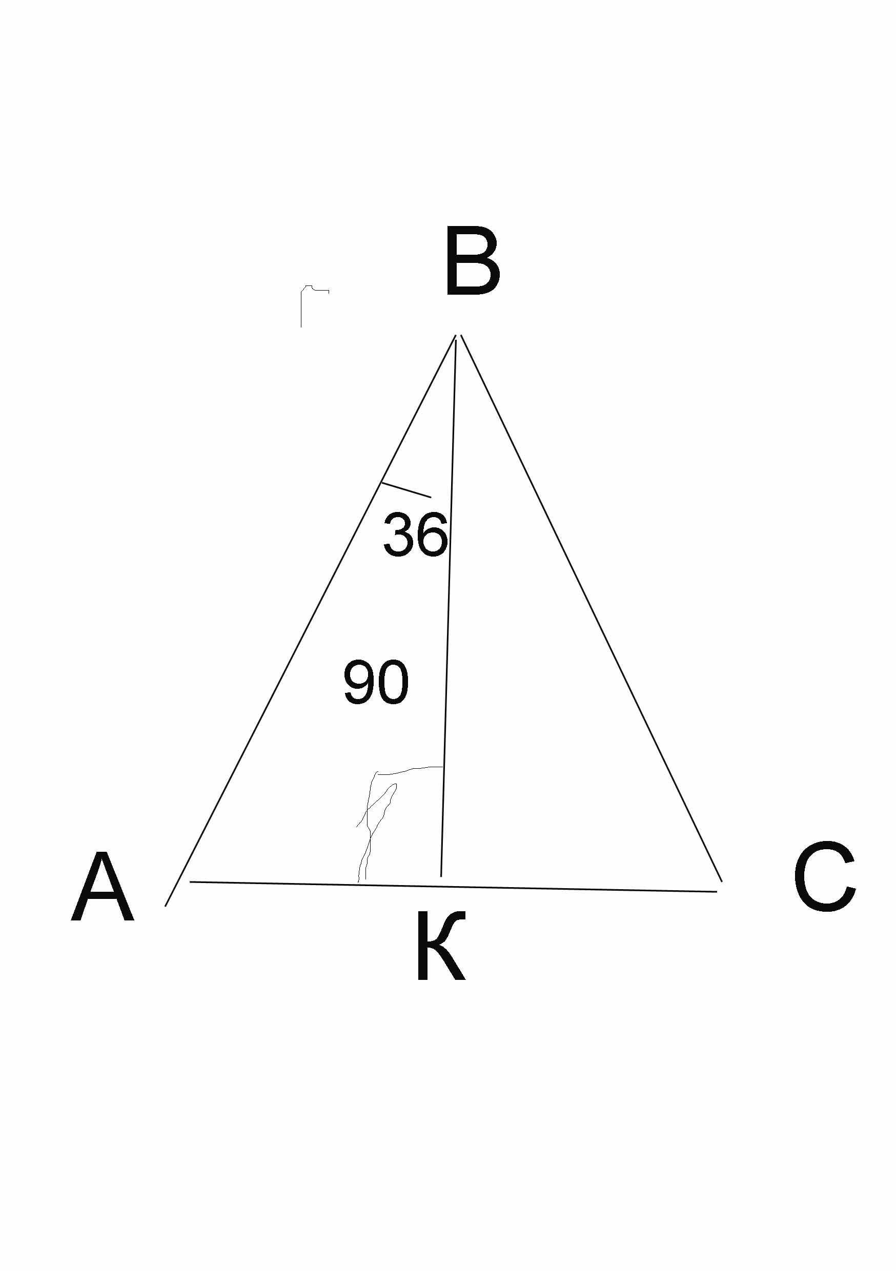 Так как АВ=ВС то треугольник равнобедренный. Следовательно ВК есть и биссектриса и высота. Тогда АВК=72/2=36 а АКВ=90