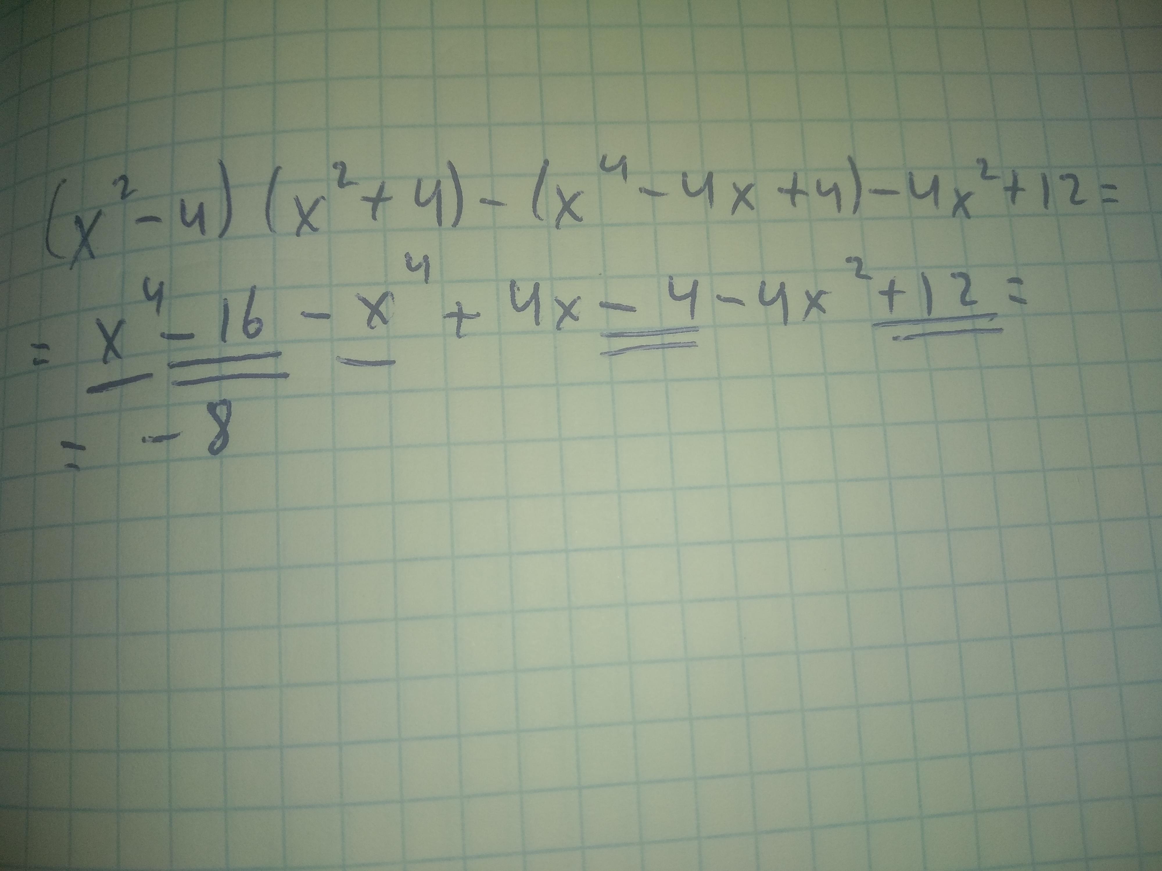 (x^2-4) (x^2+4) -(x^4-4x^2+4) -4x^2+12.