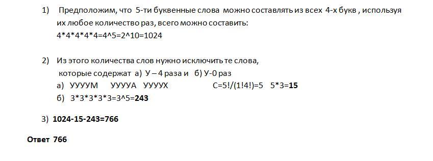 дополнение к ответу: в) исключить слово из 5-ти букв УУУУУ 766-1=765 ответ: 765
