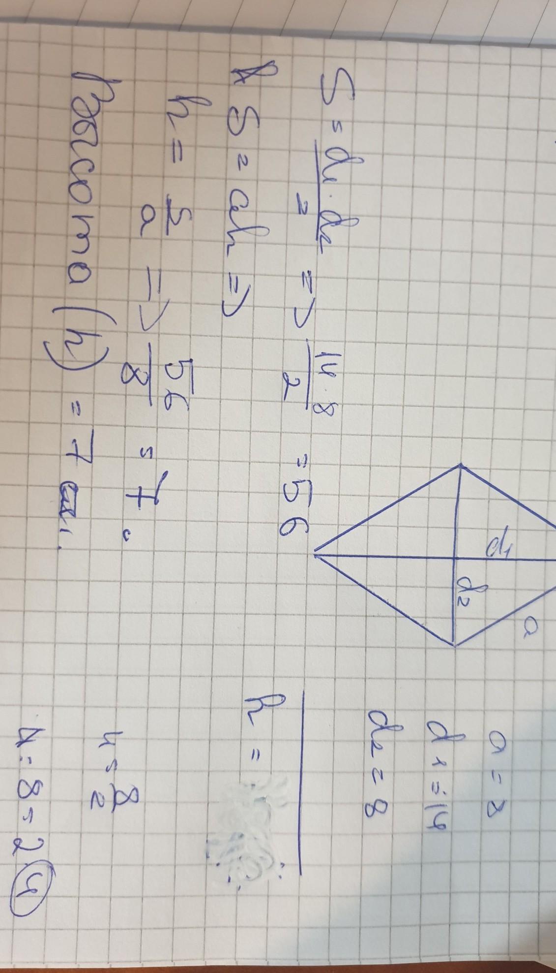 Известно,что диагонали ромба равны 6 и 14 см. Найдите высоту,проведённую в ромбе,если его сторона равна 8 см.
