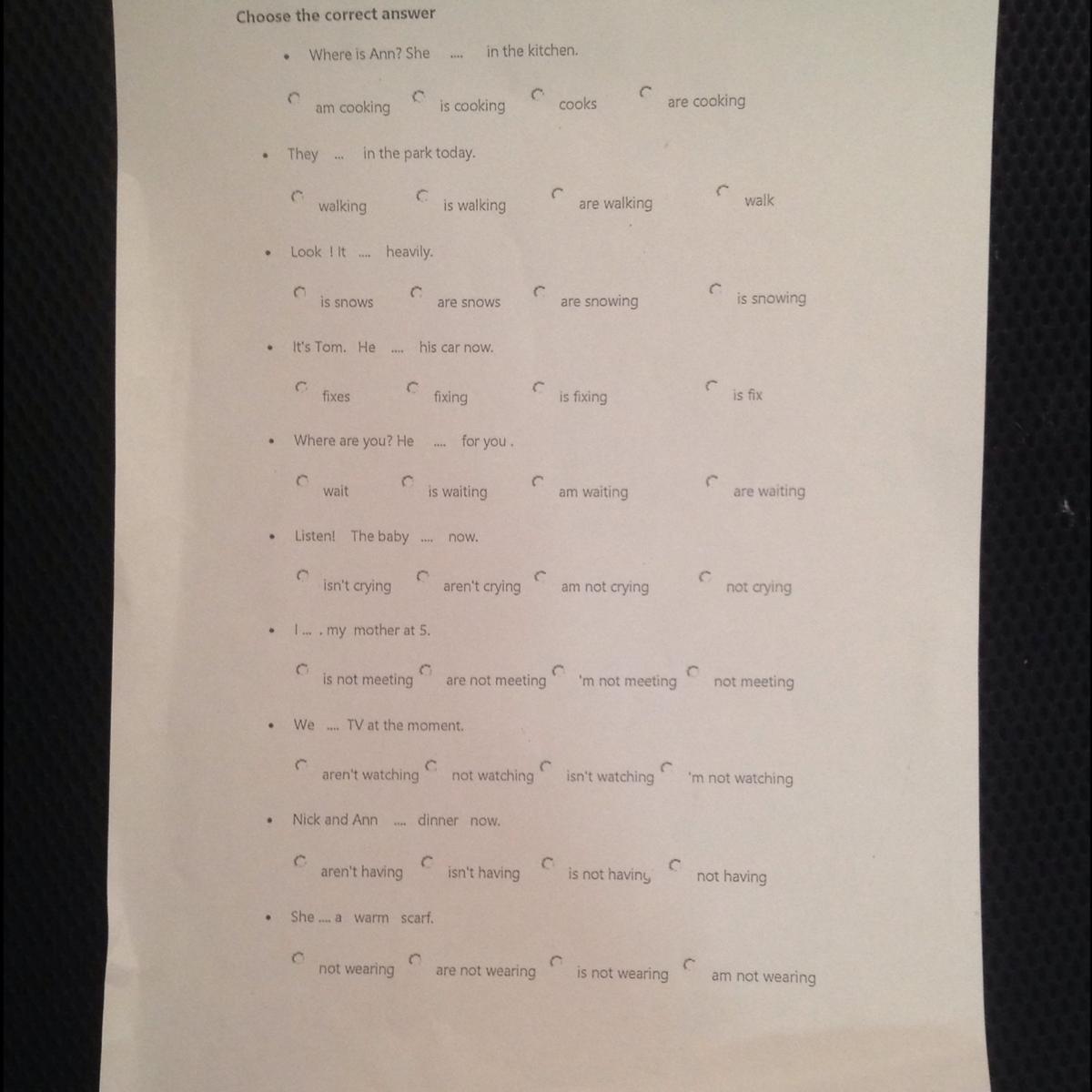1) is cooking.2)are walking.3)is snowing.4)is fixing.5)is waiting.6)isn't crying.7)'m not meeting.8)aren't watching.9)aren't having.10)is not wearing.