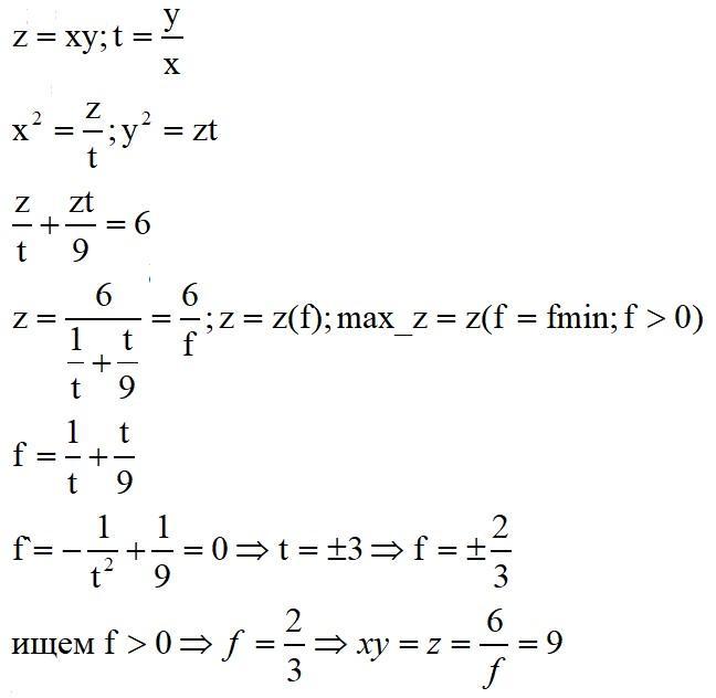 Положительные числа x и y таковы, что x^2+(y^2)/9=6. Найдите наибольшее возможное значение выражения xy.
