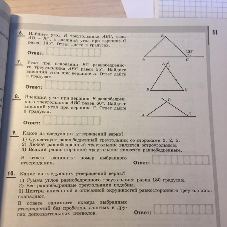 6. Внутренний угол ВСА равен 180°-135°=45°, тогда ∠С=∠А=45°, как углы при основании равнобедренного треугольника АВС.