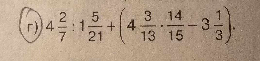 4 2/7 : 1 5/21 + (4 3/13 * 14/15 - 3 1/3)