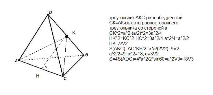 Рисуем обычную треугольню пирамиду. В основании тр-к АВС и вершина Д. На середине ВД отмечаем т.М.Соединяем А и М, С и М. На середине АС ставим т. К , соединим т К и т М. Чертеж готов.В правильном тетраэдре все ребра равны, обозначим ребро "а", все грани равны.Значит, чтобы найти полную поверхность тетраэдра надо найти площадь одного тр-ка и умножить на 4. АМ и СМ- высоты равност-х тр-ков, АМ=СМ=аV3/ 2, (V-обозначение корня), МК-высота равноб-го тр-ка АМС(и медиана), из тр-ка АМК АК=а/2 КМ^2=AM^2-AK^2=3a^2/4-a^2/4=2a^2 /4, KM=aV2 /2, S(AMC)=1/2*a*aV2 /2, 9=a^2 /4, a^2=36, a=6/
