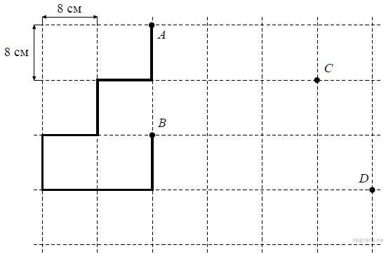 Лист бумаги расчерчен на квадраты со стороной 8 см. От точки А к точке В проведена ломаная по сторонам квадратов.