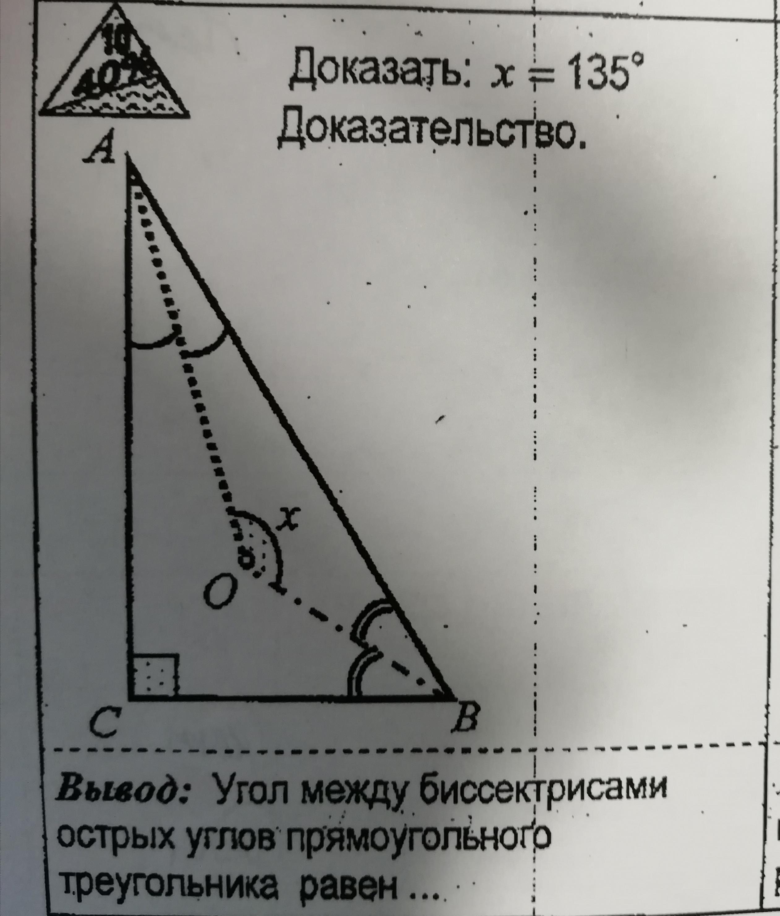 4) Углы между биссектрисами острых углов прямоугольного треугольника не зависят от величин углов и равны 45º и 135º.