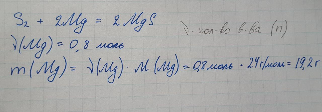Очень пожалуйста помогите! Задача: В реакции с серой взаимодействует 0,8 моль магния. Какую массу магния нужно взять для реакции?