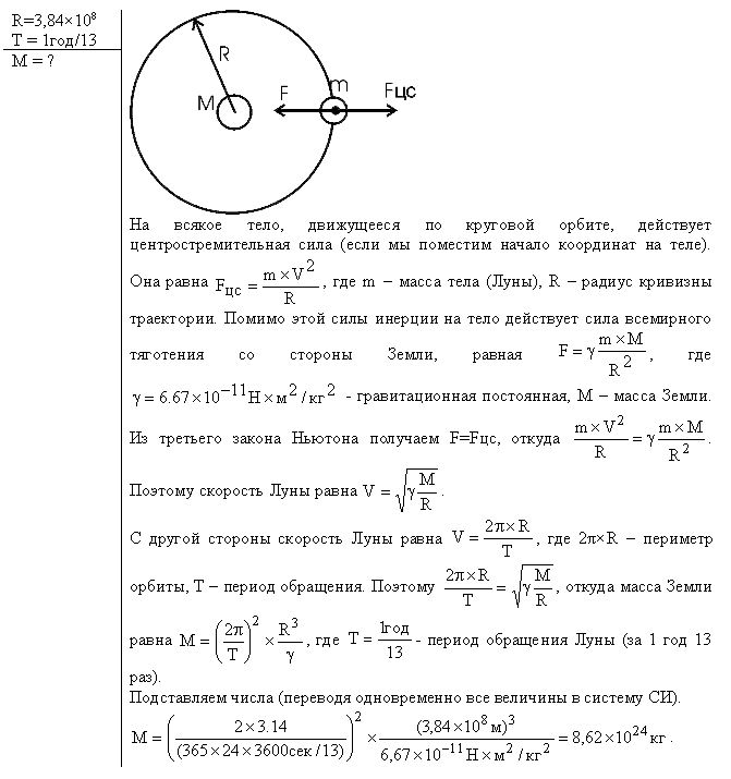 какова масса земли,если известно,что луна в течении года совершает 13 обращений вокруг земли и расстояние от земли до луны равно 3.84*10^8 м?