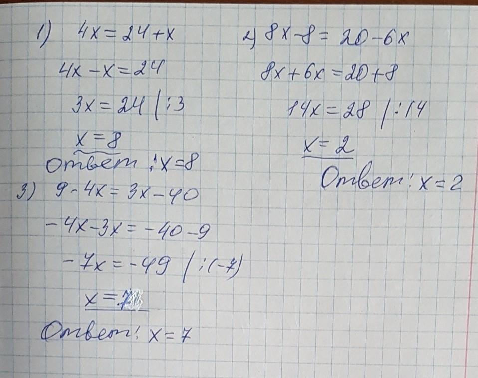 3) 9-4х = 3х - 40;