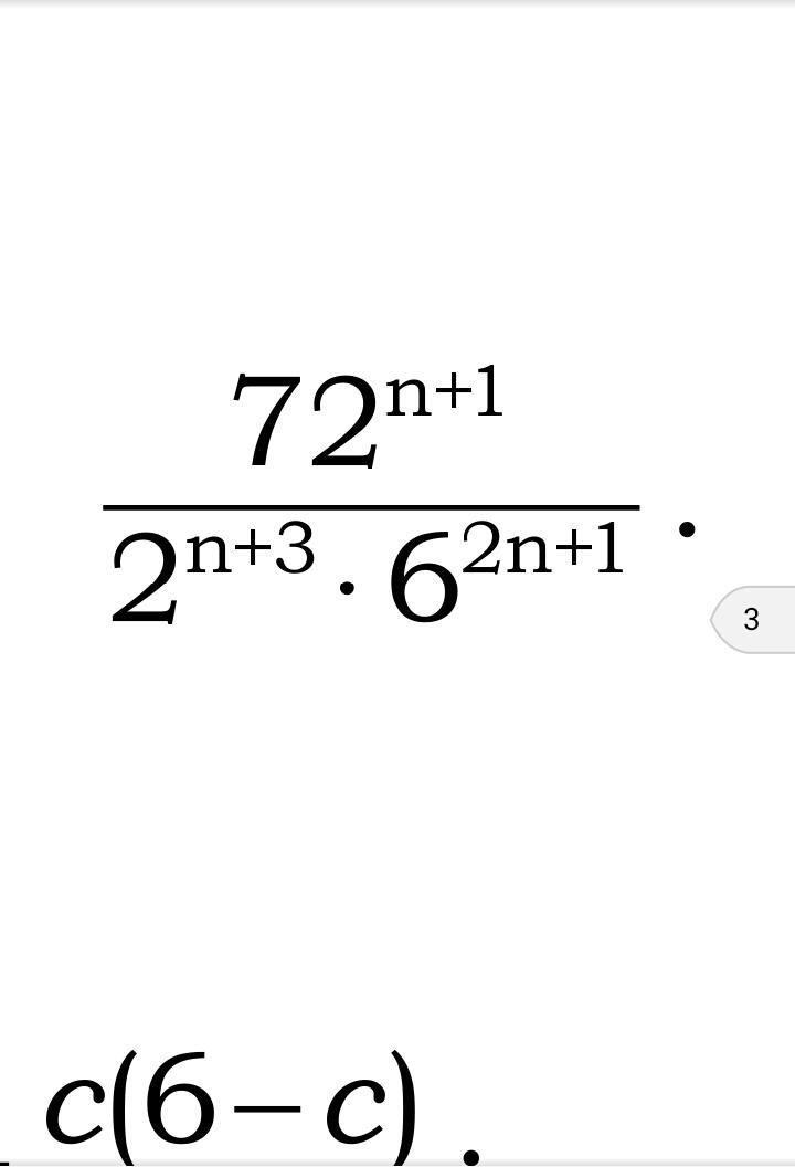 displaystylett frac{72^{n+1}}{2^{n+3}cdot6^{2n+1}}= frac{(2cdot6^2)^{n+1}}{2^{n+3}cdot6^{2n+1}}=frac{2^{n+1}cdot6^{2n+2}}{2^{n+3}cdot6^{2n+1}}=frac{2^{n}cdot2cdot6^{2n}cdot6^2}{2^ncdot2^3cdot6^{2n}cdot6}=frac{6}{2^2}=frac{6}{4} =1.5