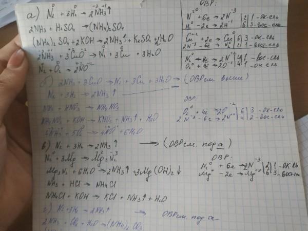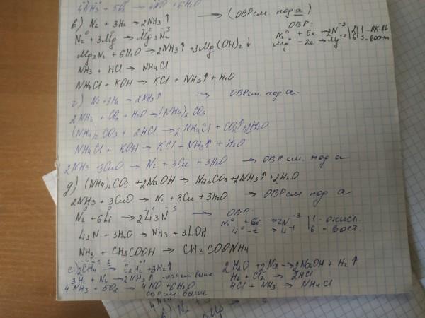 в) Аммиак - Азот - Нитрид магния - Аммиак - Хлорид аммония - Аммиак