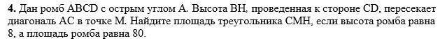 Ромб АВСД,ВН=8, Sромба=80=СД*ВН, СД*8=80, СД=10, из тр-ка ВСН СН^2=BC^2-BH^2=100-64=36, CH=6. ТР-к АВМ подобен тр-ку СМН по двум углам, тогда СН/АВ=МН/МВ, МН=х, МВ=8-х, 6/10=х / 8-х, х/ 8-х=3/5,