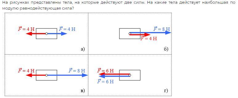 На рисунке г) равнодействующая сила направлена влево и равна 12 Н.
