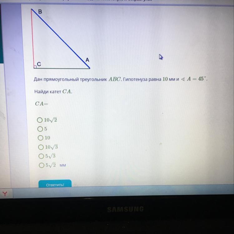 Т.к. гипотенуза, умноженная на косинус угла А, есть катет СА, то CА=10*cos45°=10√2/2=5√2/мм/