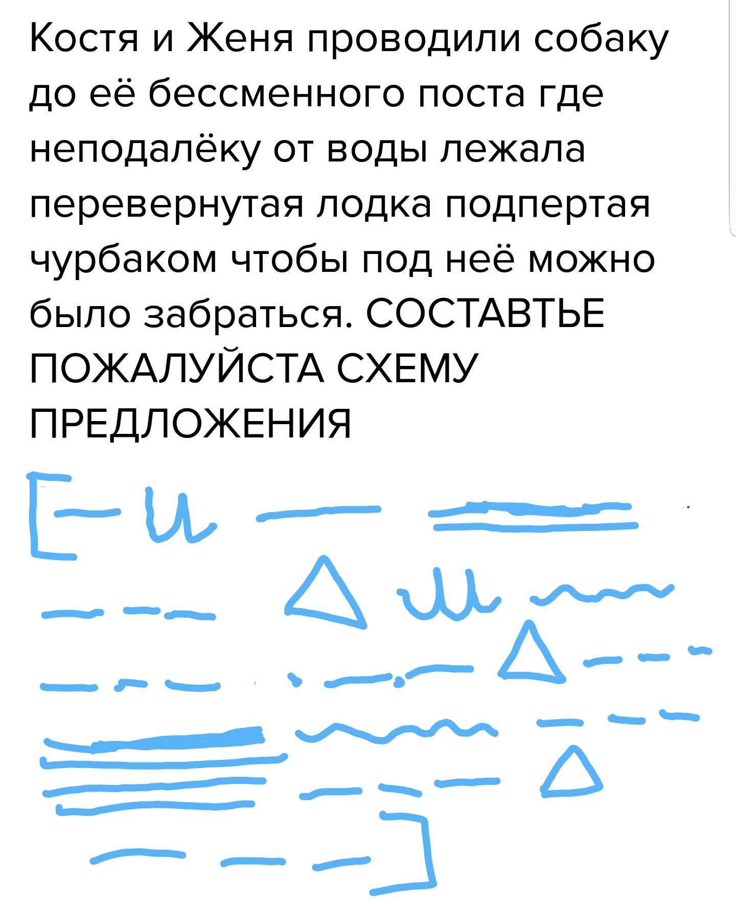 Костя и Женя проводили собаку до её бессменного поста где неподалёку от воды лежала перевернутая лодка подпертая чурбаком чтобы под неё можно было забраться. СОСТАВТЬЕ ПОЖАЛУЙСТА СХЕМУ ПРЕДЛОЖЕНИЯ