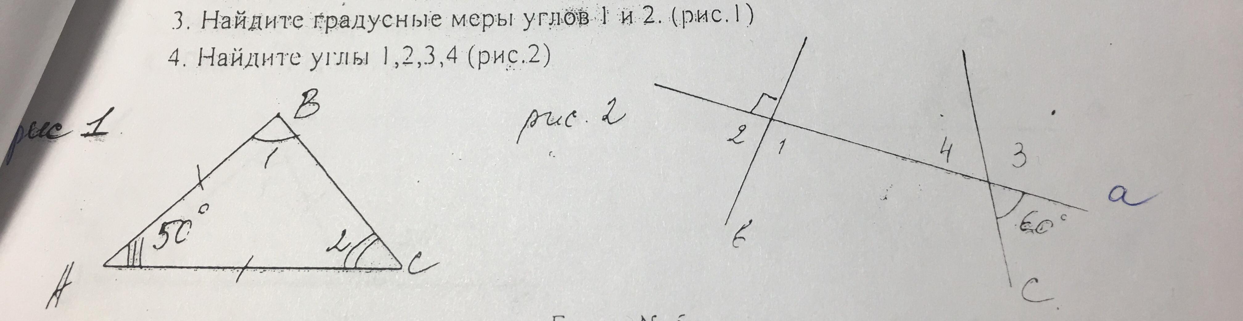 3. ∠1=∠2=(180°-50°)/2=65°, как углы при основании равнобедренного треугольника АВС, т.е. АВ=АС по условию.