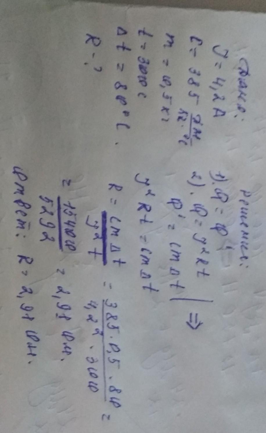 определите сопротивление нагревательного элемента паяльника,если при токе 4,2А ,медный паяльник массой 0,5 кг за 5 минут нагреется на 80°С