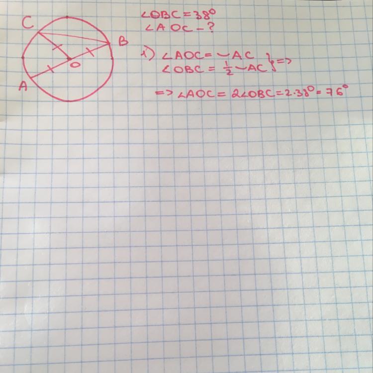 В окружности с центром в точке O проведены диаметр AB, хорда BC и радиус OC. Найдите угол AOC, если угол OBC=38 градусов. Ответ запишите в градусах