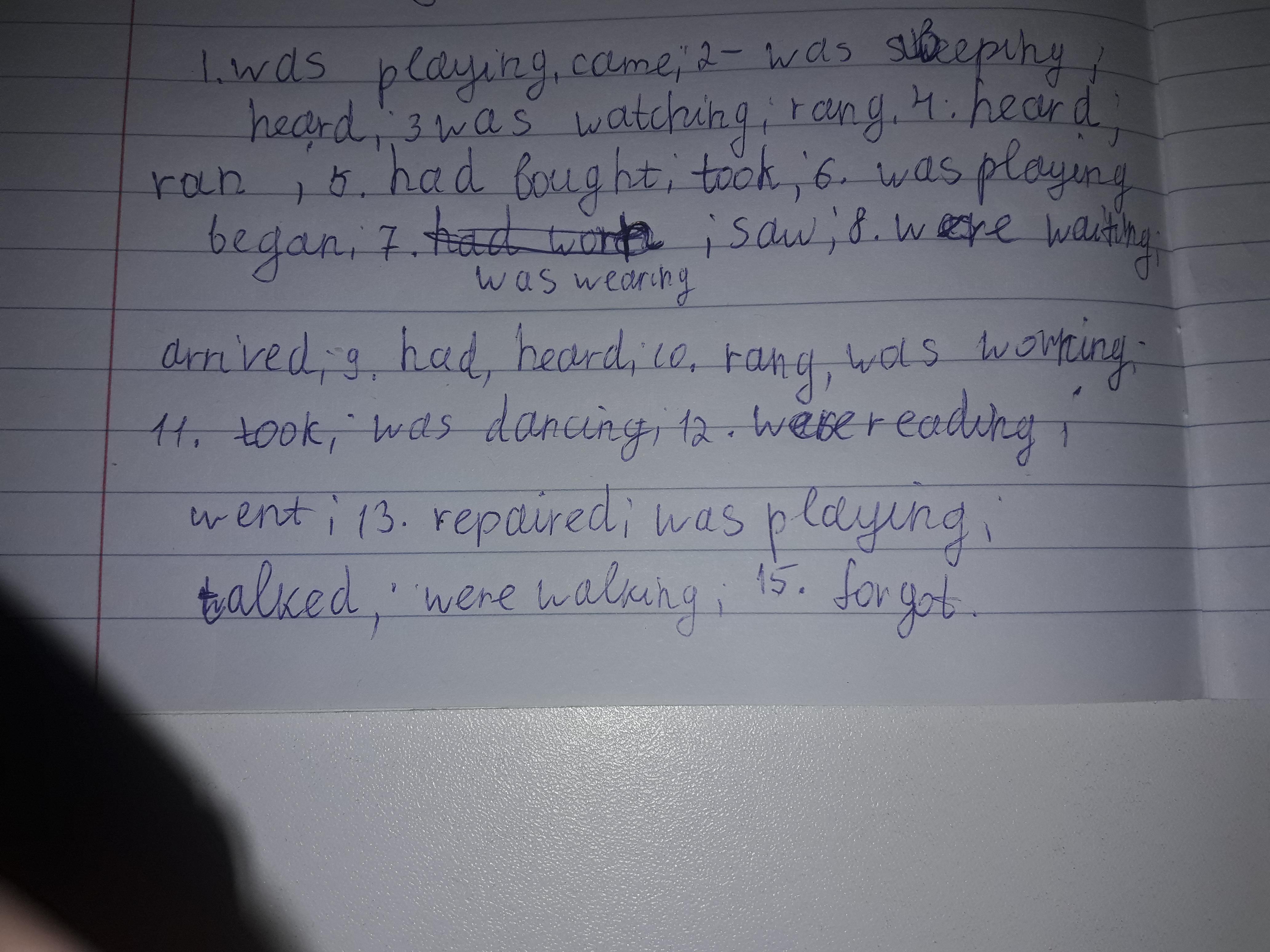 Помогите пожалуйста!!! 1. They (play) cards when the postman (come). 2. I (sweep) the floor when I (hear) a noise. 3. She (watch) TV when the doorbell (ring). 4. We (hear) a cry and (run) into the kitchen. 5. First Sam (buy) the newspaper, and then he (take) the plane to Chicago. 6. Susan and Sally (play) tennis when it (begin) to rain. 7. I think she (wear) her new hat when I (see) her at the zoo. 8. A lot of children (wait) at the station when the star (arrive). 9. They (have) their supper when they (hear) about the accident. 10. When the phone (ring), mum (work) in the garden. 11. Sally (take) a photo when I (dance). 12. They (read) a book when the lights (go) out. 13. While George (repair) his bike, Bill (play) computer games. 14. We (talk) about the movie while we (walk) home. 15. They (forget) our lunch at home last Friday.