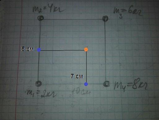 Xc = (m3+m4)*a / M = (6+8)*10 / 20 = 7 см