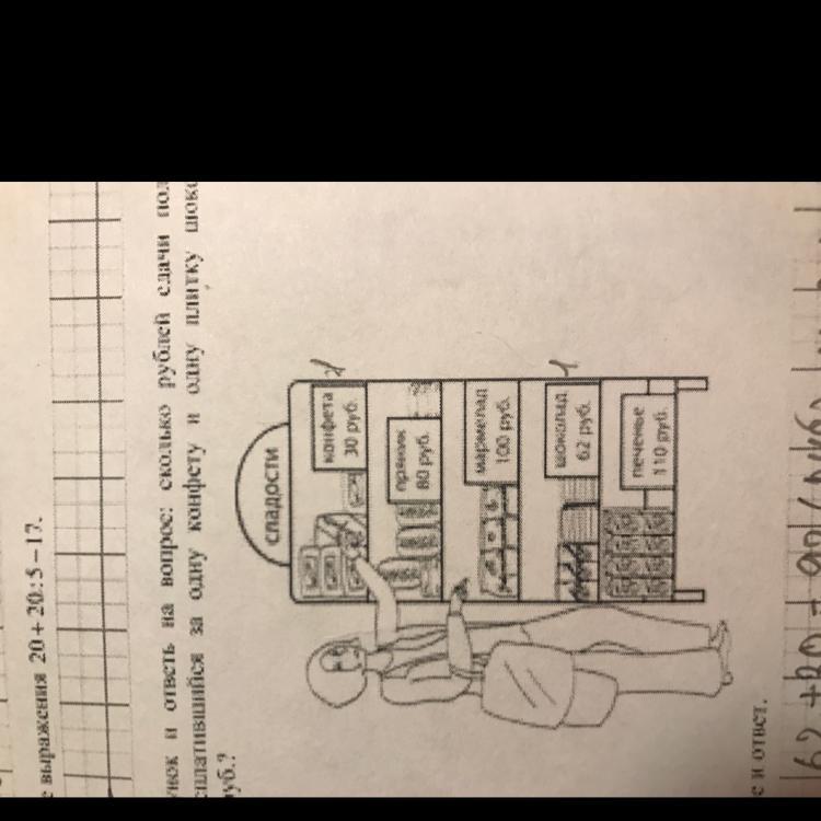 Рассмотри рисунок и ответь на вопрос: сколько рублей сдачи получит покупатель расплатившийся за одну конфету и одну плитку шоколада купюрой в 100р