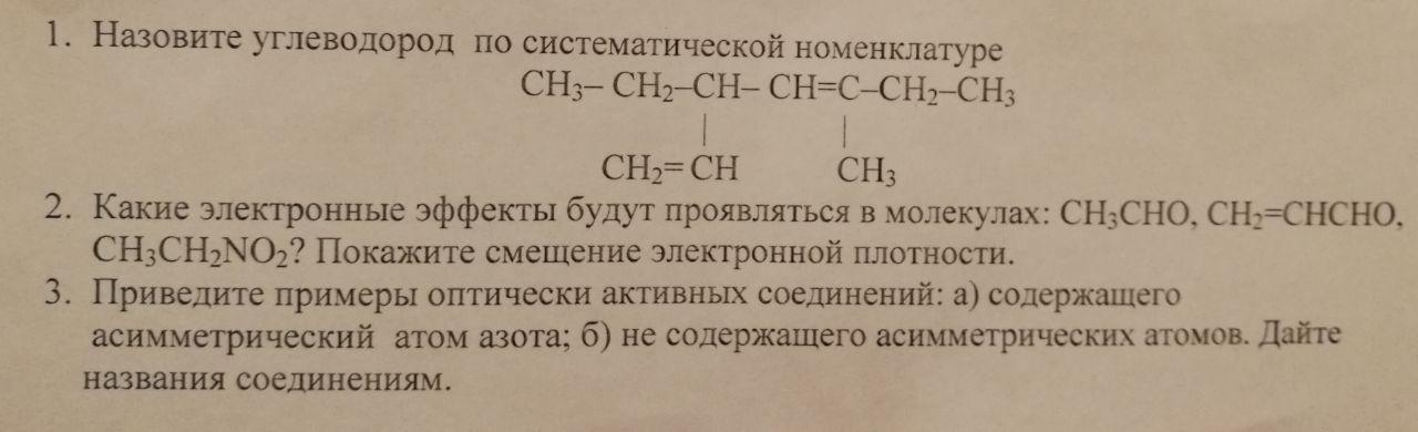 Назовите углерод по систематической номенклатуре, смещение электронной плотности, оптически активные соединения. Помогите, пожалуйста
