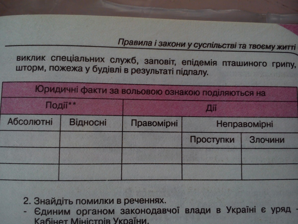 Події абсолютні- повінь, шторм. відносні - епідемія пташиного грипу. Дії правомірні- договір дарування, заповіт. неправомірні проступки- поява на робочому місті у нетверезому стані, неправдивий виклик спеціальних служб. Злочин хуліганство, розбій, пожежа у будівлі врезультаті підпалу.