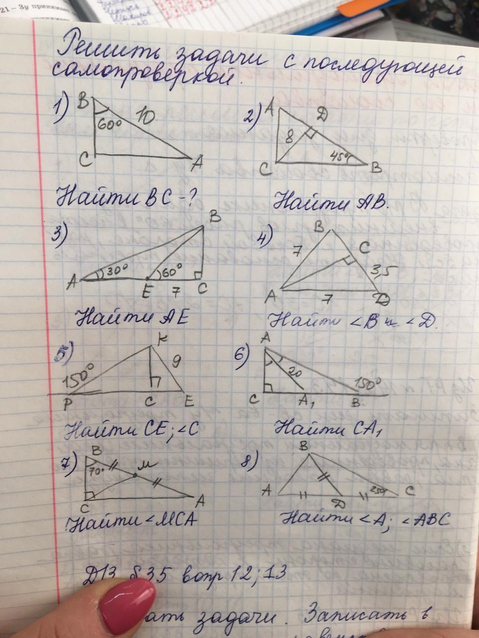 7. медиана в прямоугольном треугольнике, проведенная из прямого угла, равна половине гипотенузы => СМ=МА => треуг. СМА равнобедренный => угол МСА=угол МАС. Из треуг. ВАС: угол МАС= 180-90-70=20 градусов.