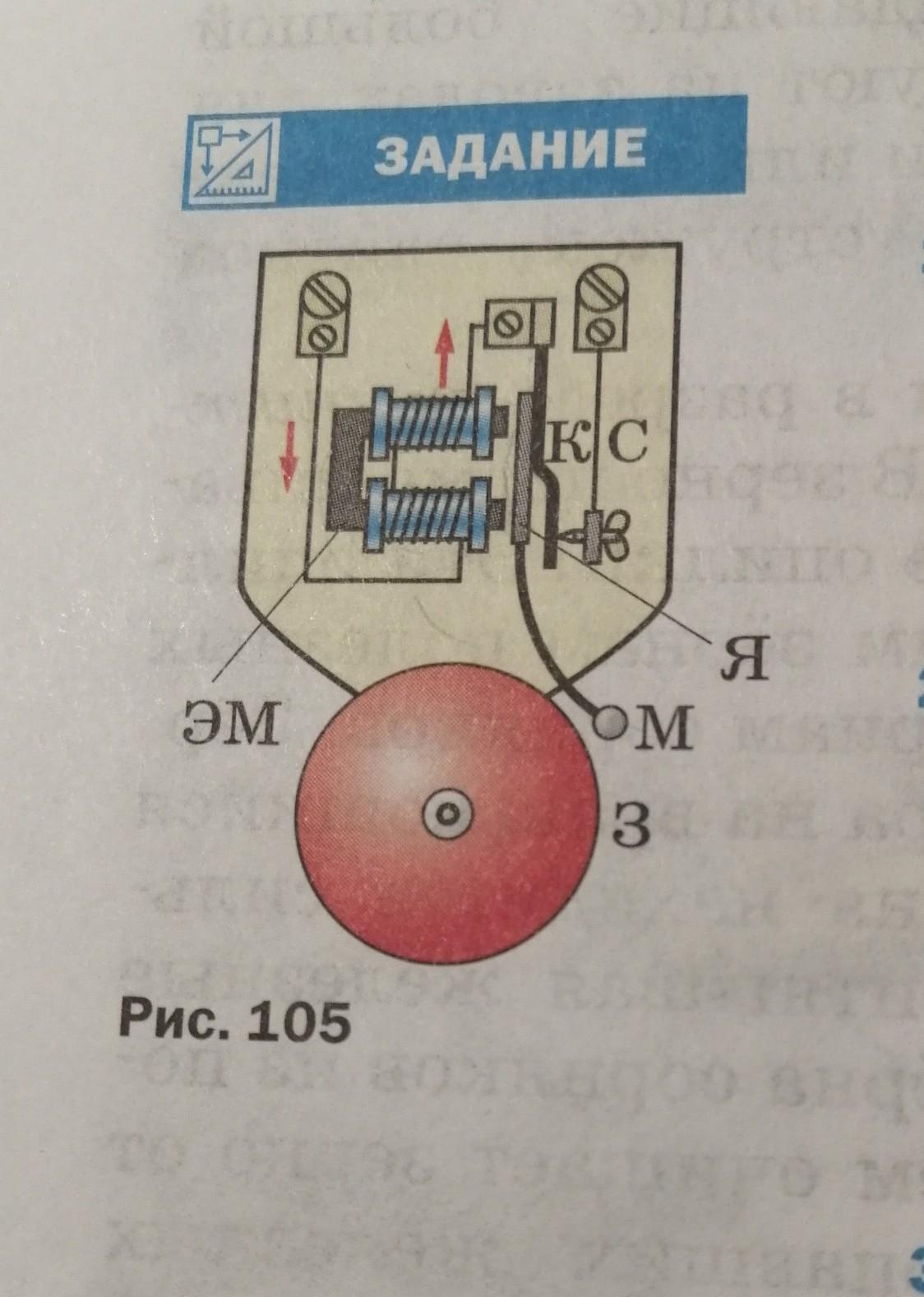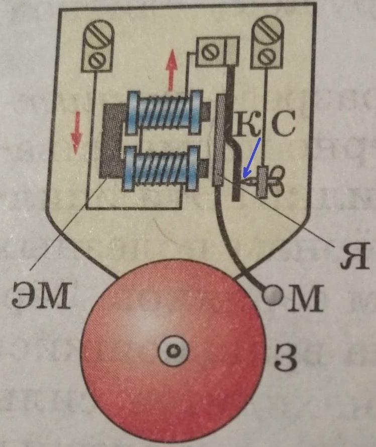 Если нажать на кнопку звонка, то потечет ток через катушки электромагнита, контактную пружину, острый винт (отмечен синей стрелкой). Электромагнит притянет якорь (контактную стальную пружину) и цепь разорвется между острием винта и якорем. Ток прекратится, магн поля не будет и упругая пластина К опять отойдет от магнита и замкнет цепь. Далее все будет повторяться, пока замкнута кнопка. Молоточек М буде вибрировать и ударять по чашке звонка. Открывай, пришел гость.