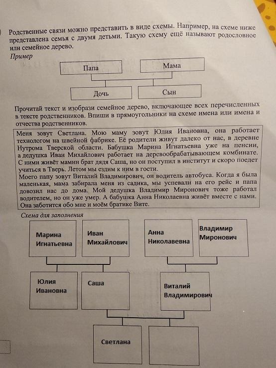 Родственные связи можно представить в виде схемы. Например, на схеме ниже представлена семья с двумя детьми.Такую схему ещё называют родословное или семейное дерево.